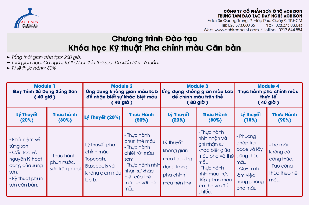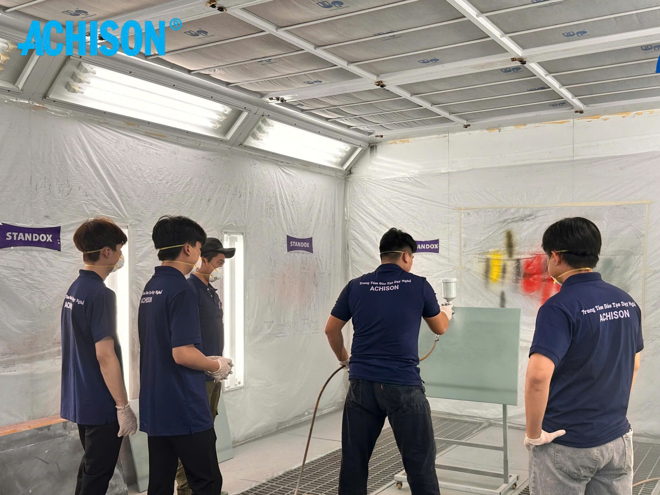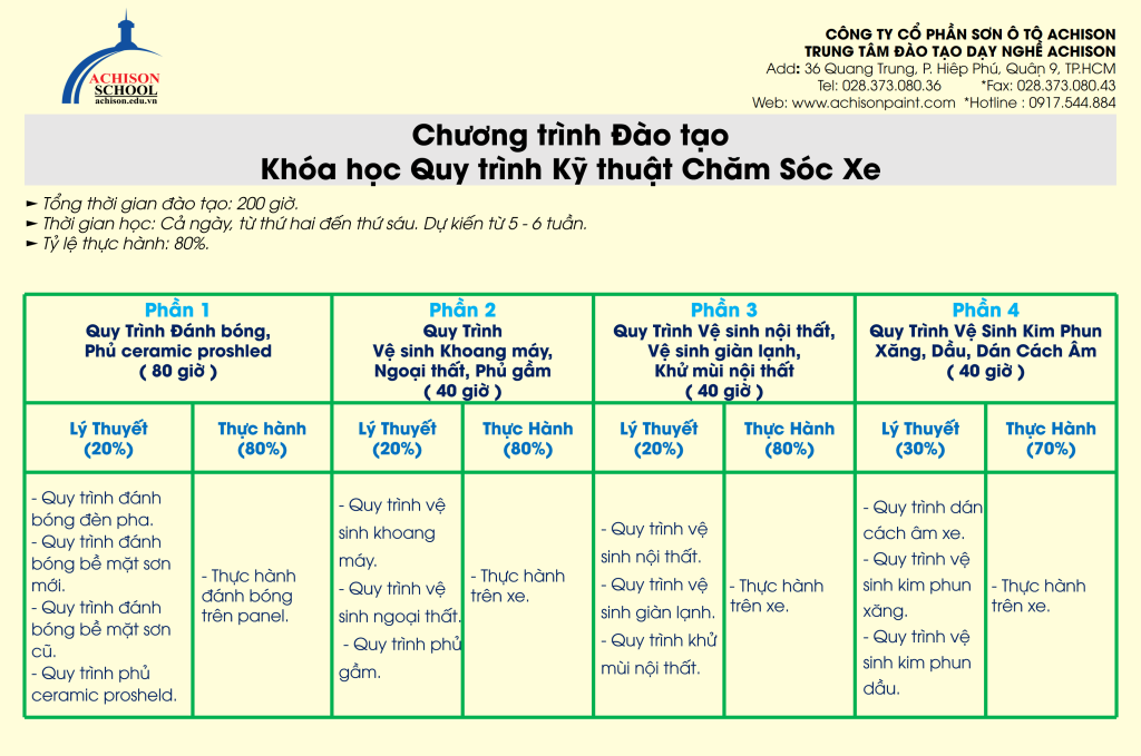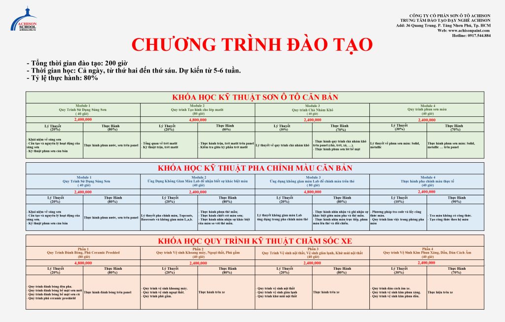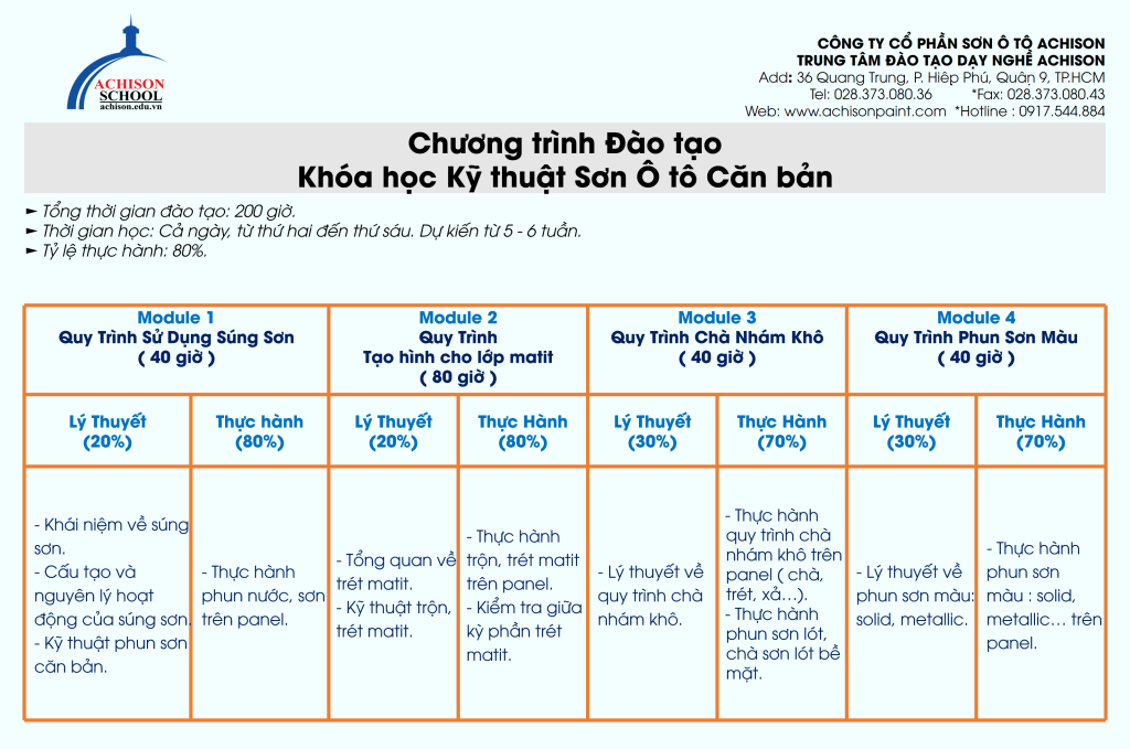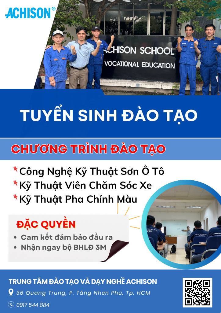 Achison School là trung tâm đào tạo nghề kỹ thuật ô tô uy tín, chuyên đào tạo các lĩnh vực sơn ô tô, pha chỉnh màu và chăm sóc xe. Chương trình học được xây dựng theo tiêu chuẩn kỹ thuật của ngành đồng – sơn, chú trọng thực hành giúp học viên nhanh chóng thành thạo tay nghề và sẵn sàng làm việc sau khi tốt nghiệp.