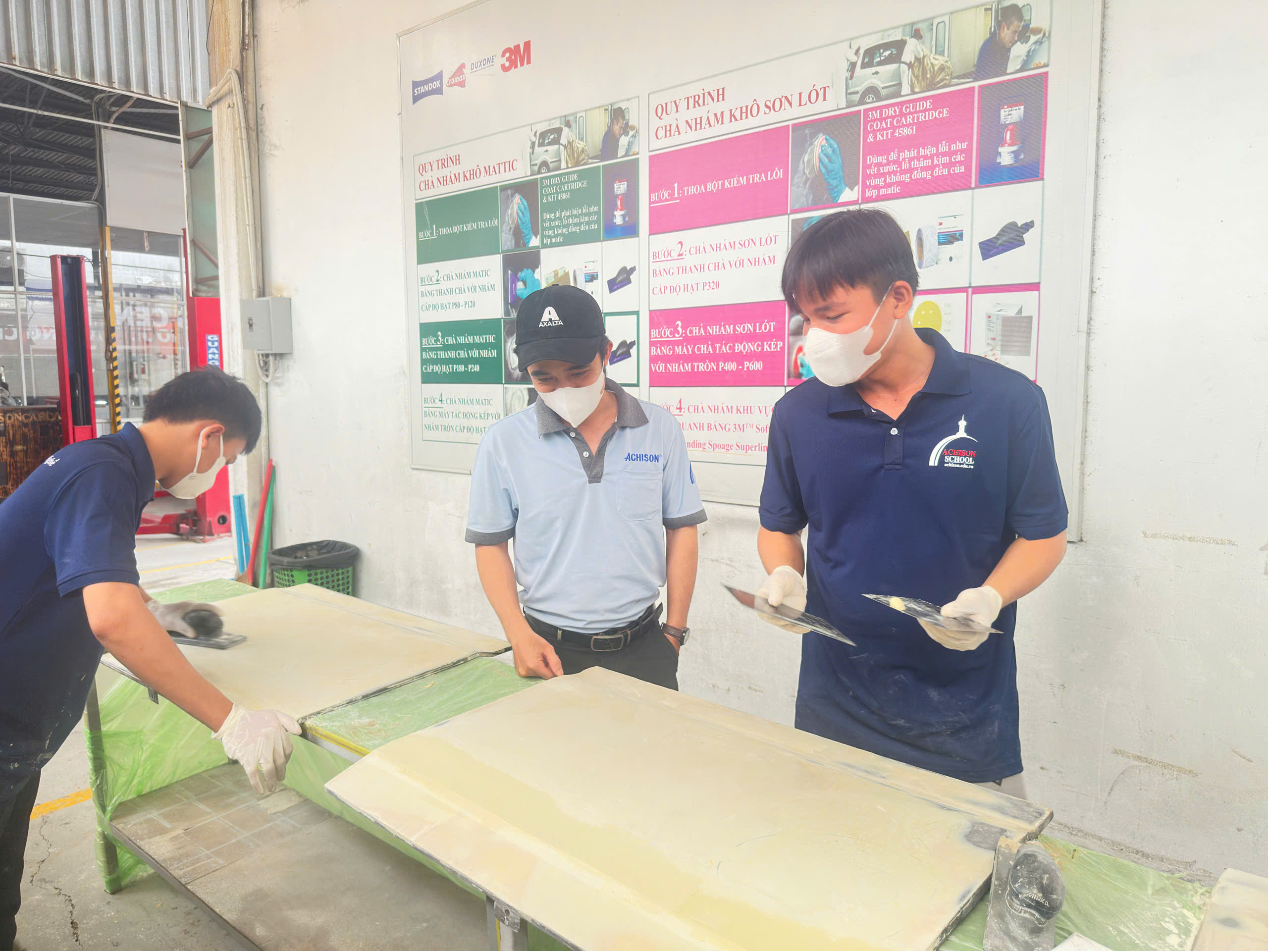 Đào tạo quy trình chuẩn trong ngành sơn ô tô như xử lý bề mặt, tạo hình matit, chà nhám và phun sơn hoàn thiện.